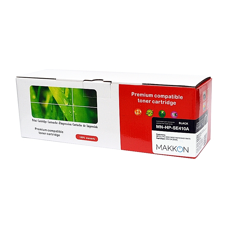 Картридж CE410A (305A) аналог от торговой марки MAKKON - это совместимый картридж для принтеров и МФУ HP CLJ Pro 300 M351, M375, HP CLJ Pro 400 M451, M475. Это аналог HP 305A (CE410A).