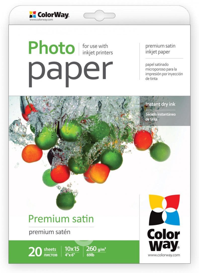 Фотопапір сатин 10x15, 20 аркушів, 260 г/м2, (PS2600204R) ColorWay - для струменевого друку. Папір має з обох боків листа високий ступінь білизни та матову рівну поверхню, що забезпечує високий контраст, відсутність відблисків, відбитків пальців на нанесеному зображенні. Ідеально підходить для друку фотореалістичних проспектів, рекламних листків, листівок та ін. Має широку колірну гамму і гарне вбирання чорнила. Чим менший у паперу показник щільності (вказується на упаковці від 140 до 250, вимірюється в г/м.кв.), тим менше має бути заливка листа.